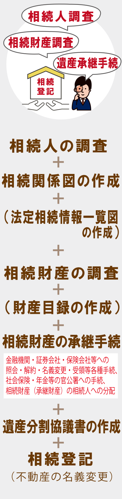 ・相続人調査以外にも、相続財産調査や預貯金の解約・払戻し、不動産の相続手続きなどの相続手続をまるごと依頼したい。